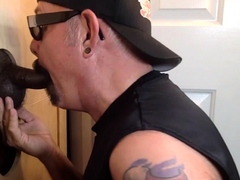 Gray DILF tastes cum after giving blowjob through gloryhole